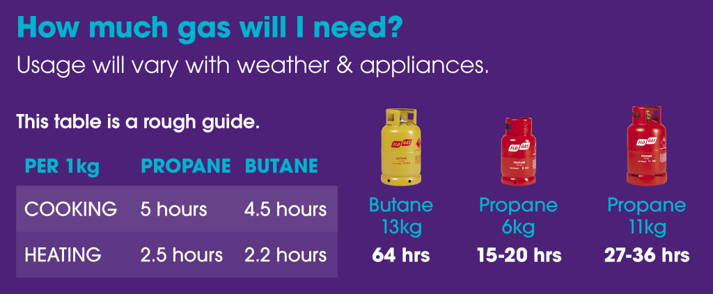 How long a gas bottle lasts depends on the appliance, the weather and how often you use it. The figures below are a rough guide to help you plan.