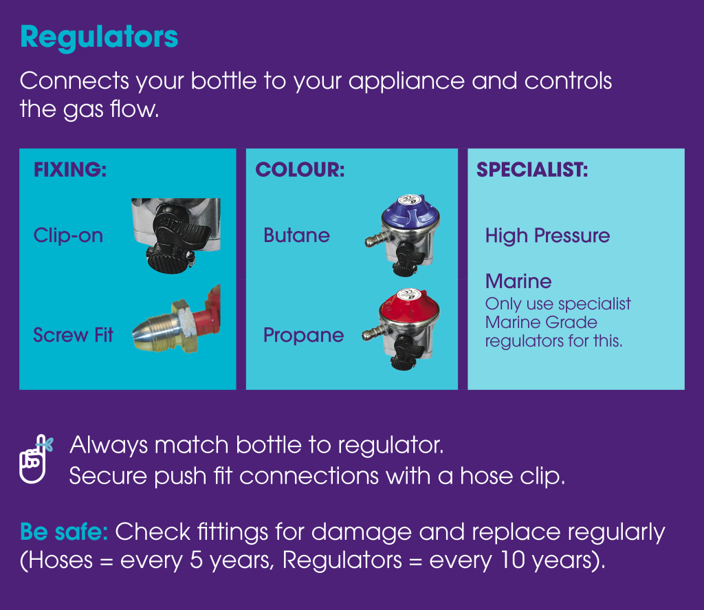 Your regulator connects the gas bottle to your appliance and controls the flow of gas. Using the right regulator is important for safe and reliable operation.